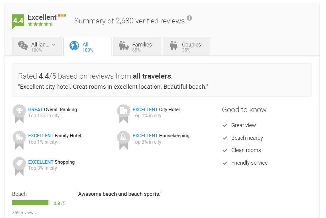 Each category will show the average rating for more specific topics in order from highest to lowest. Each topic will also feature a comment from a guest. For example, under the “Families” category, topics include: location, room, pool, and more.